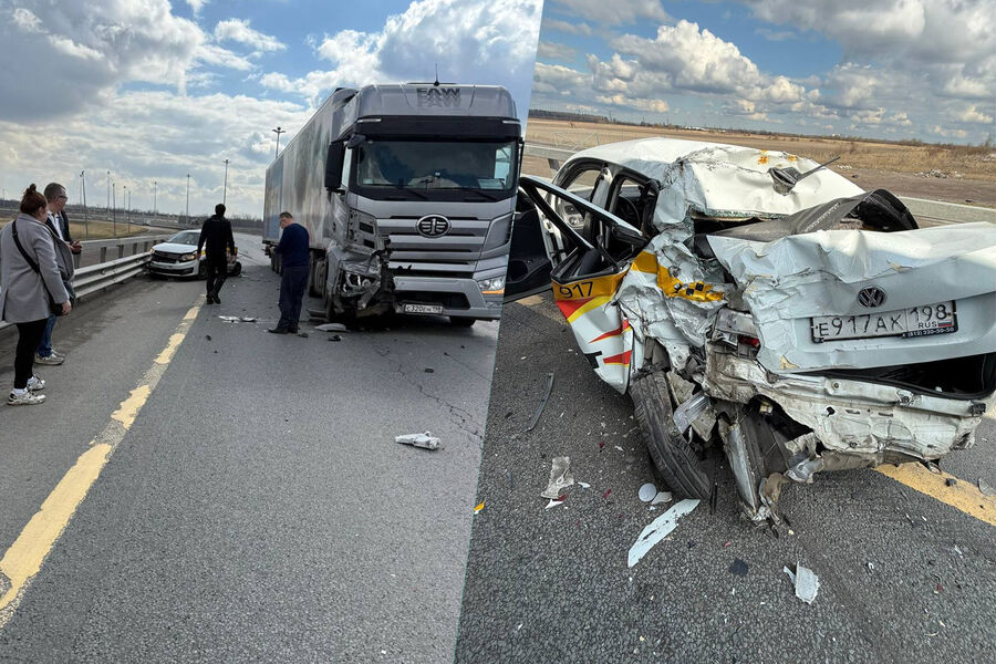 По размещенных в сети кадрах видно, что в результате ДТП машина такси получила серьезные повреждения: у транспорта смят кузов, разбит капот, бампер, стекла, багажник, детали разбросаны по проезжей части и пробиты колеса. При этом у большегруза повреждена только передняя часть.