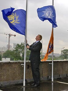 После пресс-конференции главный энергетик страны провел символическое прощание с РАО, опустив флаг монополии у входа в офис на проспекте Вернадского. Впрочем, вместо полотнища с эмблемой монополии в небо сразу взмыли флаги бывших дочерних компаний энергохолдинга, напоминая тем самых, что на энергорынке будут теперь работать множество генерирующих, сетевых и сбытовых компаний. Ушла в прошлое и эмблема монополии —