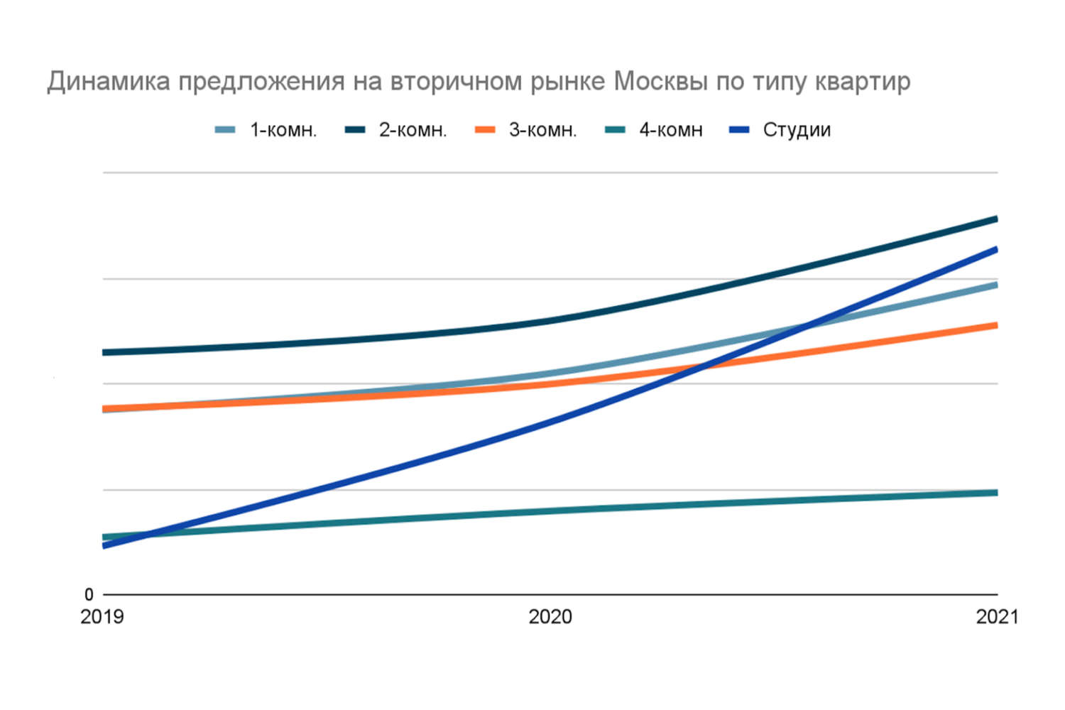 Предложение столичных студий за последние два года, напротив, выросло более чем в три раза — с 7% в 2019-м до 24% в 2021-м. А спрос на покупку таких квартир за последний год оказался взрывным — в большинстве округов Москвы за 2021 год он вырос более чем на 100%.