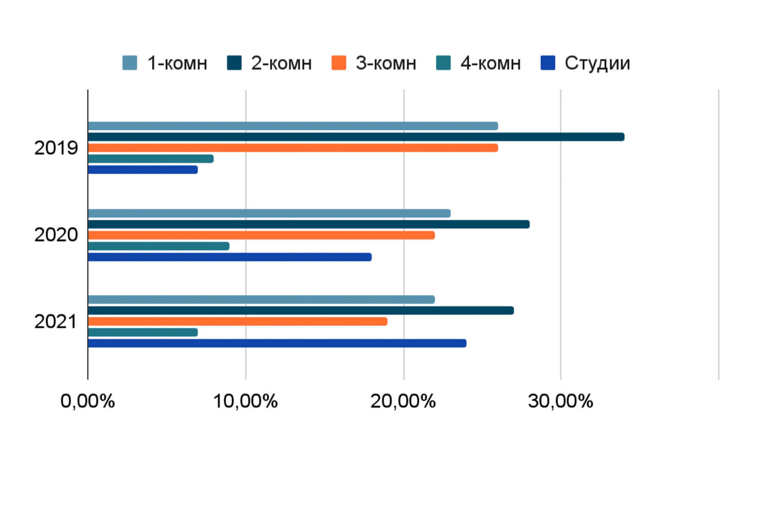 Наибольшая доля предложения на московском вторичном рынке недвижимости последние два года была у двухкомнатных квартир — более 30% в 2019-м и 27–28% в 2020–21 годах. Количество трешек, выставленных на продажу, за это время также уменьшилось — с 26% в 2019-м до менее 20% в 2021-м. Та же тенденция наблюдалась и в сегменте столичных однушек — их число на вторичке уменьшилось с 26 до 22% от общего числа квартир, рассказали в «Авито Недвижимости».