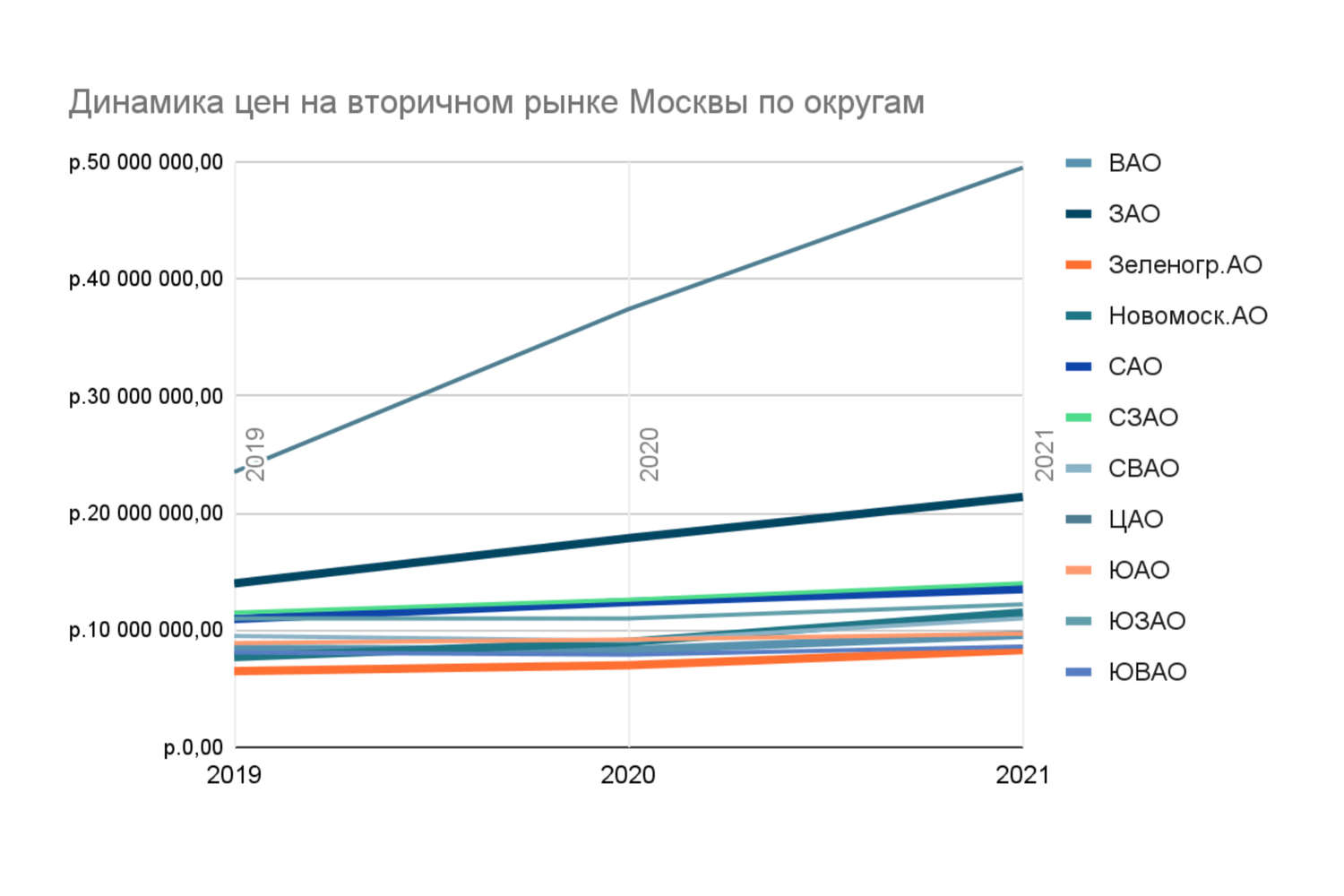 Традиционно самым прибыльным сегментом вторичного рынка московской недвижимости является Центральный административный округ (ЦАО). В центре столицы стоимость выставленной на продажу квартиры в 2021 году в среднем составила 50 млн рублей.