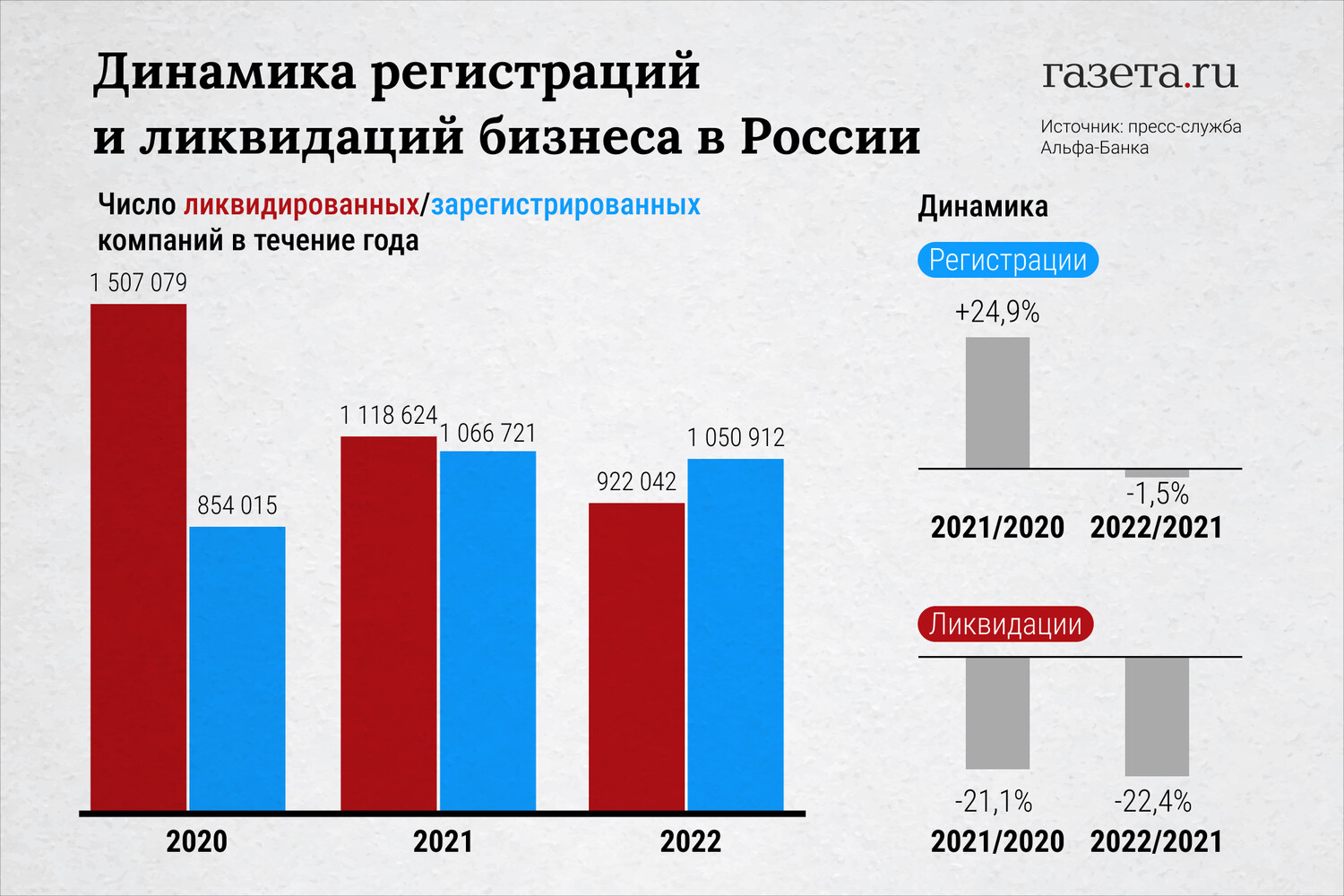А количество регистраций новых компаний осталось почти на прежнем уровне (снижения на 1,5% или порядка 15 тыс.). В итоге количество новых зарегистрированных в 2022 году бизнесов превысило количество закрытых компаний — впервые за три года.