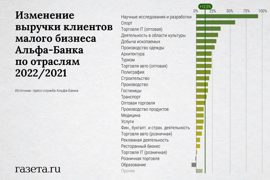 В качестве основных факторов, которые поддержали деловую активность и предпринимательство в стране, аналитики отмечают следующее. Бизнес перестраивался и находил новые ниши. По данным аналитики цифровой платформы МСП.РФ, несмотря на падение в торговле, совокупные доходы малого и среднего бизнеса в 2022 году выросли на 10% и составили 21,6 трлн рублей. Прирост выручки обеспечили компании из сферы гостиничного бизнеса и общественного питания, информации и связи, культуры, спорта и развлечений. Это подтверждается и данными Альфа-Банка: общая выручка обсуживающихся в банке компаний малого бизнеса в прошлом году выросла на 12%, несмотря на отрицательную динамику в розничной торговле и образовании.