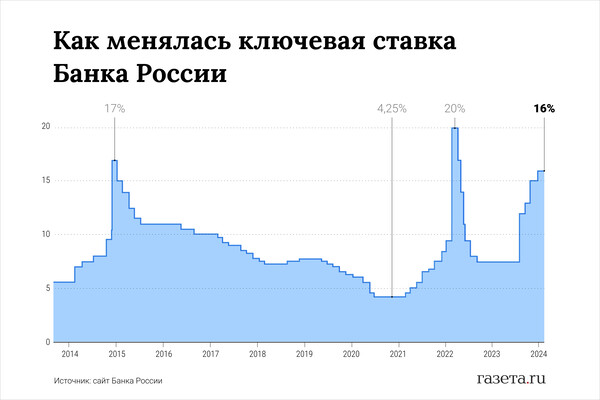 С 15 декабря 2023 года ключевая ставка составляет 16% годовых. 16 февраля регулятор оставил ее на этом уровне. Следующее заседание ЦБ по ключевой ставке — 22 марта. Регулятор опубликует свой пресс-релиз с решением в 13:30 мск на сайте.