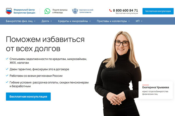 Чтобы начать сотрудничество, оставьте заявку на сайте с именем и номером телефона — юрист перезвонит в течение нескольких минут, разберёт вашу ситуацию и назовёт ориентировочную стоимость списания долгов.