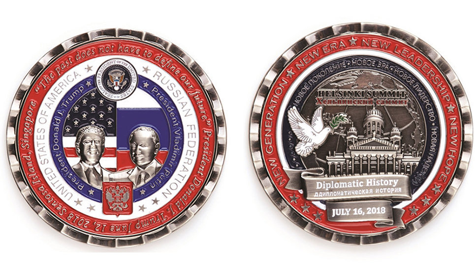 На монете, которую Белый дом отчеканил в честь встречи президента России Владимира Путина и президента США Дональда Трампа в Хельсинки, содержатся грубые опечатки в тексте на русском языке. Монета была выставлена на продажу на сайте Белого дома.