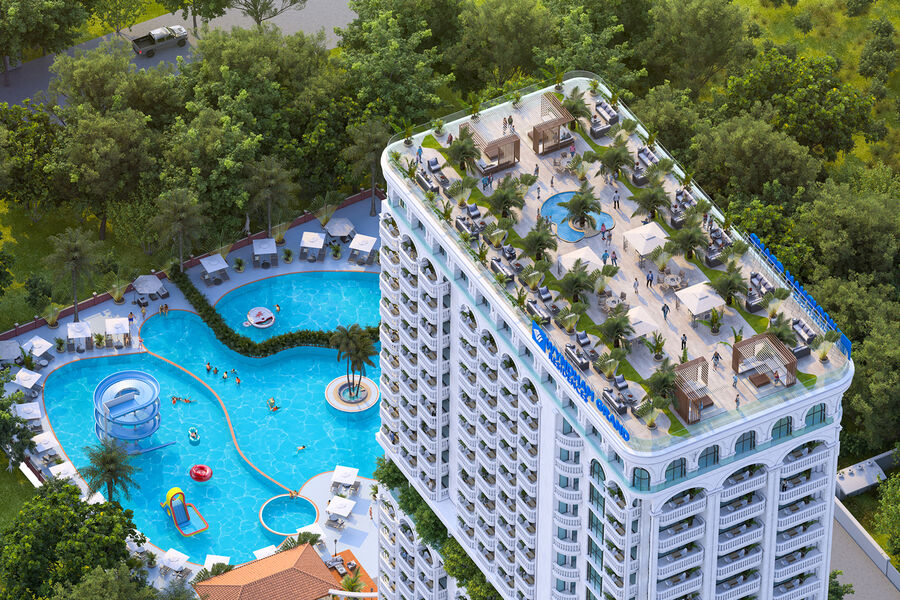 Всего в комплексе отелей на площади 15 000 м2 разместят 75 объектов инфраструктуры (СПА, ресторанов, аквазоны, баров, детских центров и т.д.). Также в комплексе разместят клинику физиотерапии.
