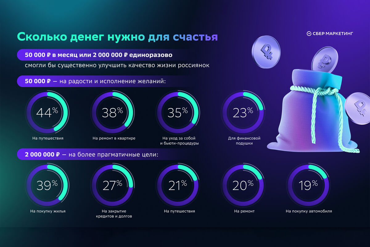 В ходе исследования респонденток попросили назвать сумму, которая смогла бы существенно улучшить качество их жизни. Большинство указало 50 тыс. рублей в месяц. Участницы опроса признаются, что лишние деньги они, скорее всего, потратили бы на различные радости и исполнение желаний. 44% начали бы больше путешествовать, 38% сделали бы ремонт в квартире, а 35% потратили бы средства на здоровье и уход за собой. Откладывать дополнительные средства в финансовую подушку согласны 23%.