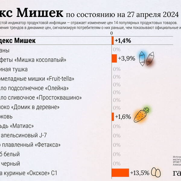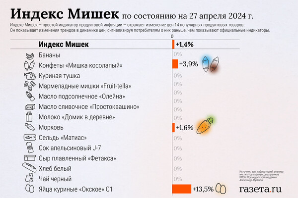 С 20 по 27 апреля 2024 года Индекс Мишек вырос на 1,4% по сравнению с 0,9% неделей ранее. Об этом «Газете.Ru» рассказал автор индекса — заведующий лабораторией анализа институтов и финансовых рынков ИПЭИ Президентской академии Александр Абрамов.