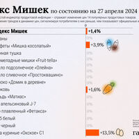 «Мишковая инфляция немного ускорилась. Однако повода для тревоги пока нет, рост во многом связан с техническим фактором. Из 14 товаров изменились цены по трем продуктам. Вновь, как и неделей ранее, подорожали конфеты «Мишка косолапый» — на 3,9%, и морковь — на 1,6%», — сказал Абрамов.