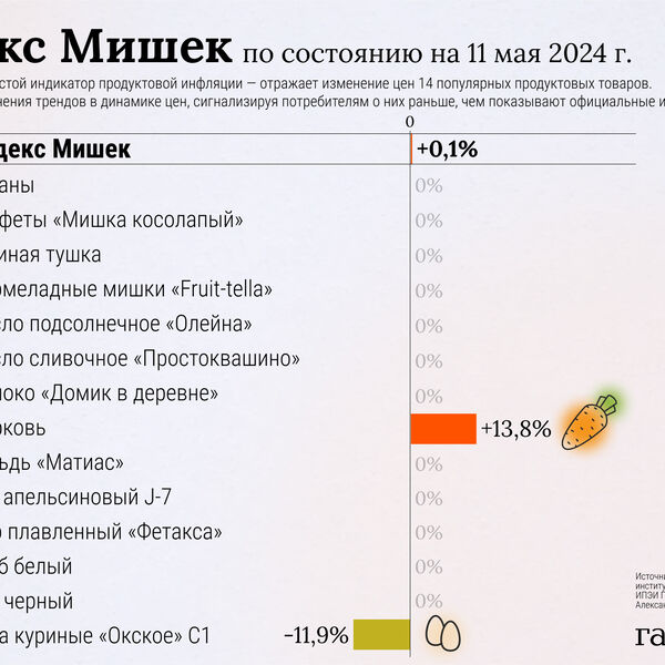 С 4 по 11 мая 2024 года Индекс Мишек вырос на 0,1%, тогда как неделей ранее он снижался на 2,7%. То есть инфляция в России немного ускорилась. Это произошло из-за повышения цен на морковь на 13,8%, рассказал «Газете.Ru» автор индекса — заведующий лабораторией анализа институтов и финансовых рынков ИПЭИ Президентской академии Александр Абрамов.
