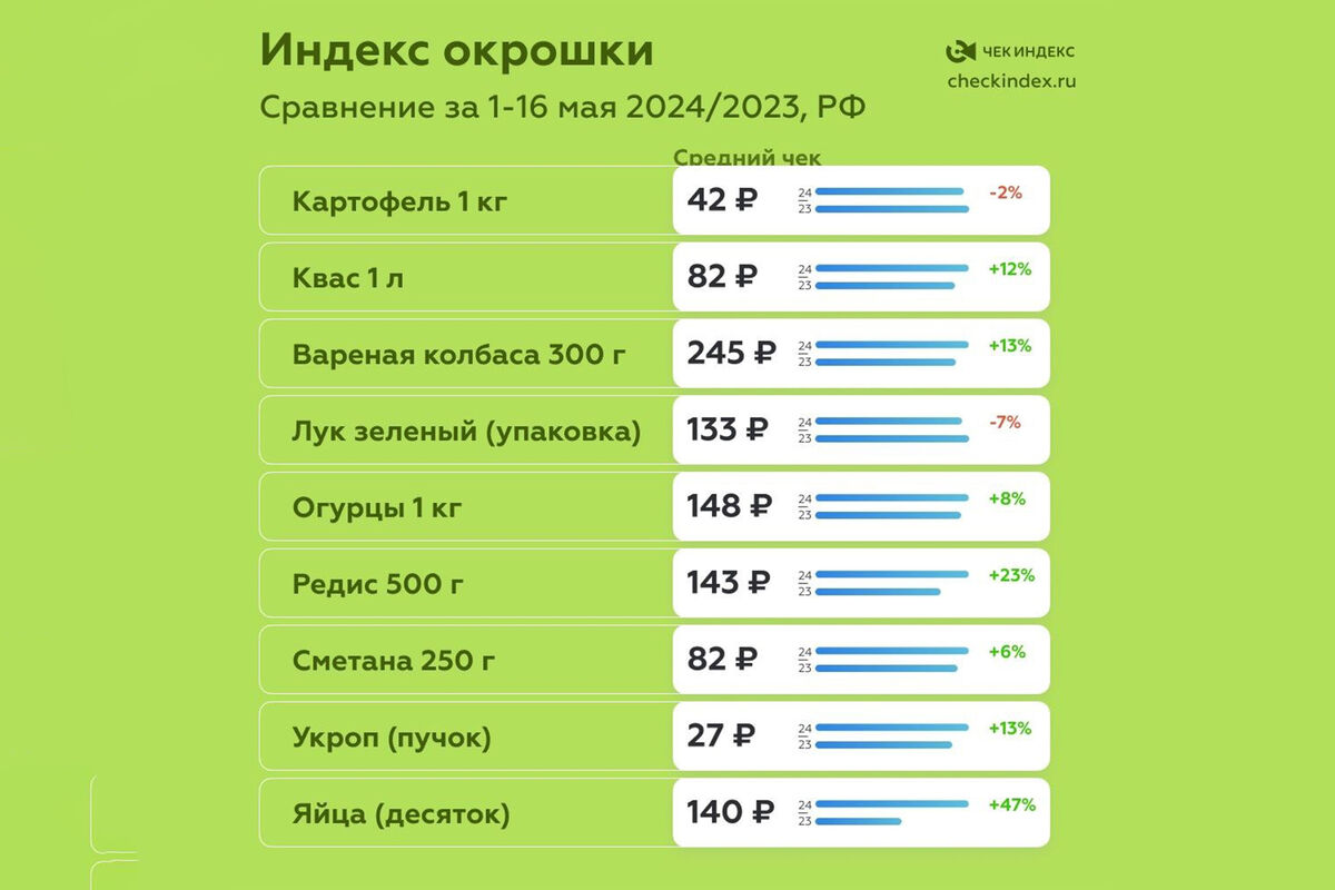 С 1 по 16 мая 2024 года средний чек набора продуктов для окрошки увеличился на 13% по сравнению с аналогичным периодом прошлого года, до 1042 рублей. Расходы на приготовление супа на четырех человек за год (так называемый Индекс окрошки) выросли на 12%, до 687 рублей в среднем. Такую статистику по запросу «Газеты.Ru» предоставили в пресс-службе аналитического ресурса «Чек Индекс» компании «Платформа ОФД».