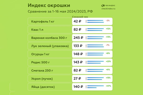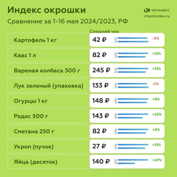 Больше всего из ингредиентов для окрошки подорожали яйца — на 47% за год, до 140 рублей за десяток. 500 г редиса в этом году обойдутся россиянам в 143 рубля (+23% за год). Вареная колбаса подорожала на 13%, в мае 2024 года 300 г обойдутся россиянам в 245 рублей. Укроп повысился в цене также на 13%, до 27 рублей за пучок. Квас прибавил в стоимости 12%, до 82 рублей за литр. 1 кг огурцов стал дороже на 8% (148 рублей), а сметана — на 6% (82 рубля за 250 г). Упаковка зеленого лука снизилась в цене на 7% за год (до 133 рублей). Картофель подешевел на 2%, до 42 рублей за 1 кг.