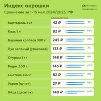 В онлайн-магазинах такой набор для окрошки обойдется в 2022 рубля, на 25% выше уровня прошлого года. В заведениях общественного питания (в среднем по всей России) на порцию окрошки в первой половине мая тратили 189 рублей, на 11% больше, чем в прошлом году в то же время. При этом объемы продаж в натуральном выражении (в шт.) этого блюда в кафе и ресторанах за год выросли на 2%.