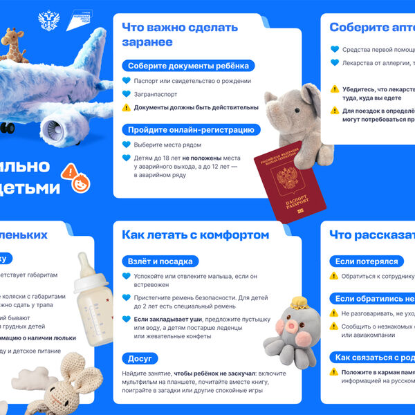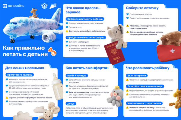 Перед полетом с детьми россиянам нужно собрать документы ребенка — паспорт или свидетельство о рождении, загранпаспорт и проверить их срок действия. Второй шаг — купить авиабилеты на места рядом. Детям до 18 лет не положены места у аварийного выхода, а до 12 лет — в аварийном ряду. Об этом говорится в памятке, подготовленной департаментом развития туризма Минэкономразвития России и сервисом для покупки авиабилетов Авиасейлс к Международному дню защиты детей 1 июня (есть у «Газеты.Ru»).