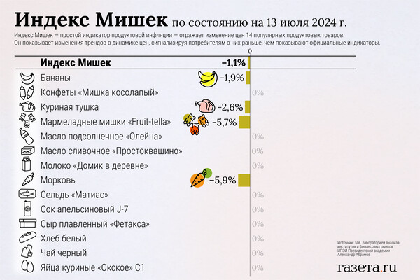 С 6 по 13 июля так называемый Индекс Мишек снизился на 1,1% против роста на 0,5% неделей ранее. За неделю не подорожал ни один из 14 товаров, которые входят в индекс. Больше всего подешевела морковь — на 5,9%. Об этом «Газете.Ru» рассказал автор индекса — заведующий лабораторией анализа институтов и финансовых рынков ИПЭИ Президентской академии Александр Абрамов.