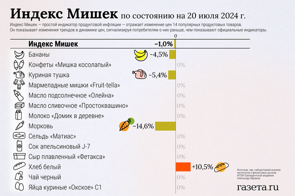 С 13 по 20 июля 2024 года так называемый Индекс Мишек снизился на 1% по сравнению с его уменьшением на 1,1% неделю назад. Это произошло за счет удешевления моркови, куриных тушек и бананов, рассказал «Газете.Ru» автор индекса — заведующий лабораторией анализа институтов и финансовых рынков ИПЭИ Президентской академии Александр Абрамов.