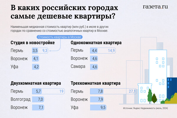 Пермь, Воронеж, Уфа, Самара и Волгоград возглавили рейтинг российских городов-миллионников по самым низким ценам на квартиры в июле. Так, студию в новостройках Перми можно было купить в среднем за 3,5 млн рублей, в Воронеже — за 4,1 млн, а в Уфе — за 4,2 млн рублей. Такую статистику «Газете.Ru» предоставили в пресс-службе компании «Яндекс Недвижимость».