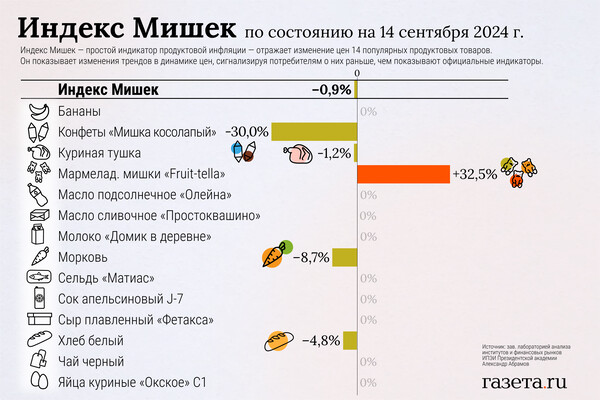 «Подорожали только мармеладные мишки Fruit-tella (+32,5%). В целом рост цен на продукты замедляется. При этом цены мишек в индексе очень волатильны», — сказал экономист.