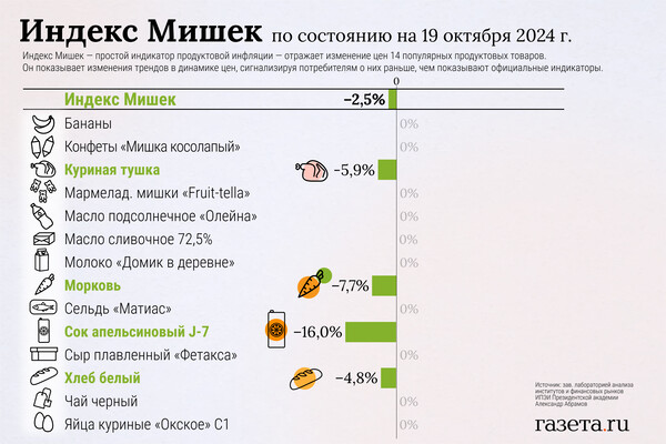 «За неделю снизились цены на апельсиновый сок J7 (-16%) после их роста две недели подряд, на морковь (– 7,7%), куриные тушки (– 5,9%) и самый дешевый батон белого хлеба (-4,8%). По разным продуктовым товарам на полках российских магазинов картина с динамикой цен была противоречивой, но ни один из 14 товаров в Индексе Мишек не подорожал», — отметил экономист.