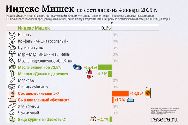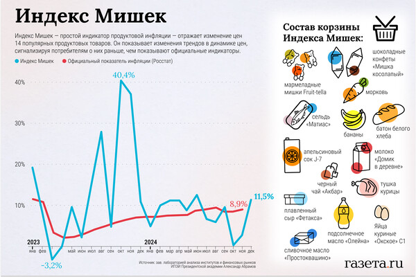 В декабре 2024 года так называемый Индекс Мишек вырос на 11,5% к декабрю 2023-го. Об этом «Газете.Ru» рассказал его создатель — заведующий лабораторией анализа институтов и финансовых рынков ИПЭИ Президентской академии Александр Абрамов.