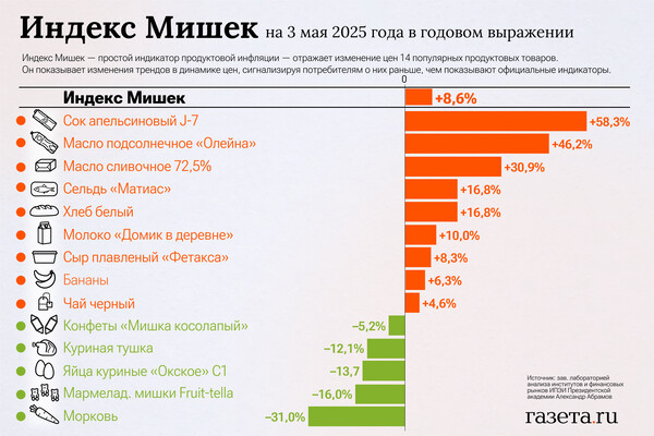«Снизились цены на конфеты «Мишка косолапый» (-18,2%) и молоко «Домик в деревне» 3,2% жирности (-12,0%). По данным на 3 мая, Индекс Мишек вырос на 8,6% за год. Подорожали апельсиновый сок J7 (+58,3%), подсолнечное масло «Олейна» (+46,2%), сливочное масло «Домик в деревне» (+30,9%), сельдь «Матиас» (+16,8%), самый дешевый белый хлеб (+16,8%), молоко «Домик в деревне» 3,2% жирности (+10,0%), плавленый сырный продукт «Фетакса» (+8,3%), бананы (+6,3%) и чай черный «Акбар» (+4,6%)», — отметил Абрамов.