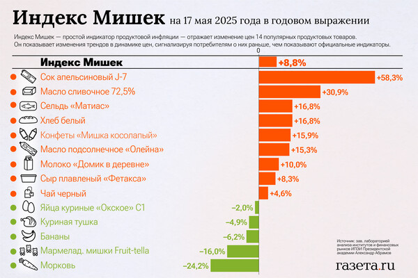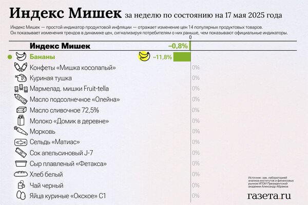 «Инфляция за неделю замедлилась. За неделю снизились цены на бананы — на 11,8%. В формате год к году инфляция тоже заметно замедлилась. За год выросли цены на апельсиновый сок J7 (+58,3%), подсолнечное масло «Олейна» (+15,3%), сливочное масло «Домик в деревне» (+30,9%), сельдь «Матиас» (+16,8%), самый дешевый белый хлеб (+16,8%), конфеты «Мишка косолапый» (+15,9%), молоко «Домик в деревне» 3,2% жирности (+10,0%), плавленый сырный продукт «Фетакса» (+8,3%) и черный чай «Акбар» (+4,6%)», — отметил Абрамов.