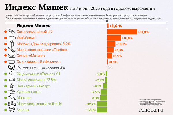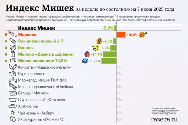 «C 31 мая по 7 июня Индекс Мишек снизился на 2,2% по сравнению с его уменьшением на 1,1% неделю назад. Инфляция за неделю замедлилась. За неделю выросли цены на морковь — на 10,0%. Снизились цены на сливочное масло «Домик в деревне» 72,5% жирности (-16,7%), молоко «Домик в деревне» 3,2% жирности (-14,7%), бананы (-6,7%) и сок апельсиновый J7 (-3,3%)», — отметил Абрамов.