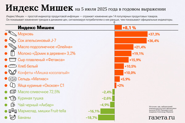 «С 28 июня по 5 июля значение Индекса Мишек выросло на 0,1% по сравнению с его увеличением на 1,8% неделю назад. Инфляция за неделю замедлилась. За неделю подорожали яйца куриные «Окские» категории С1 (+4,2%) и апельсиновый сок J7 (+3,4%). Снизились цены на морковь (-6,7%). Цены на другие товары в индексе не изменились. Значение Индекса Мишек год к году выросло на 8,1%», — отметил Абрамов.