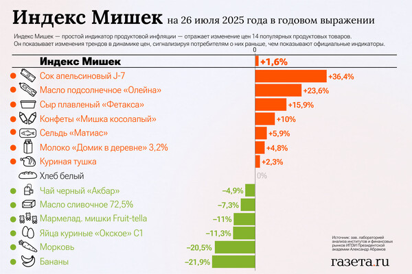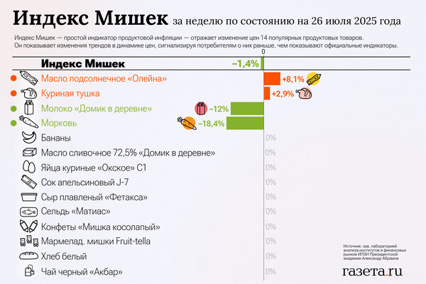 «С 19 по 26 июля значение Индекса Мишек снизилось на 1,4% по сравнению с его снижением на 2,0% неделю назад. Третью неделю подряд инфляция сокращается. Но за неделю повысились цены на масло подсолнечное «Олейна» (+8,1%) и куриные тушки (+2,9%). Цены на другие товары в индексе не изменились. В годовом выражении значение Индекса Мишек выросло на 1,6% по состоянию на 26 июля против роста на 3,9% неделей ранее. В формате год к году инфляция стабильно замедляется», — отметил Абрамов.