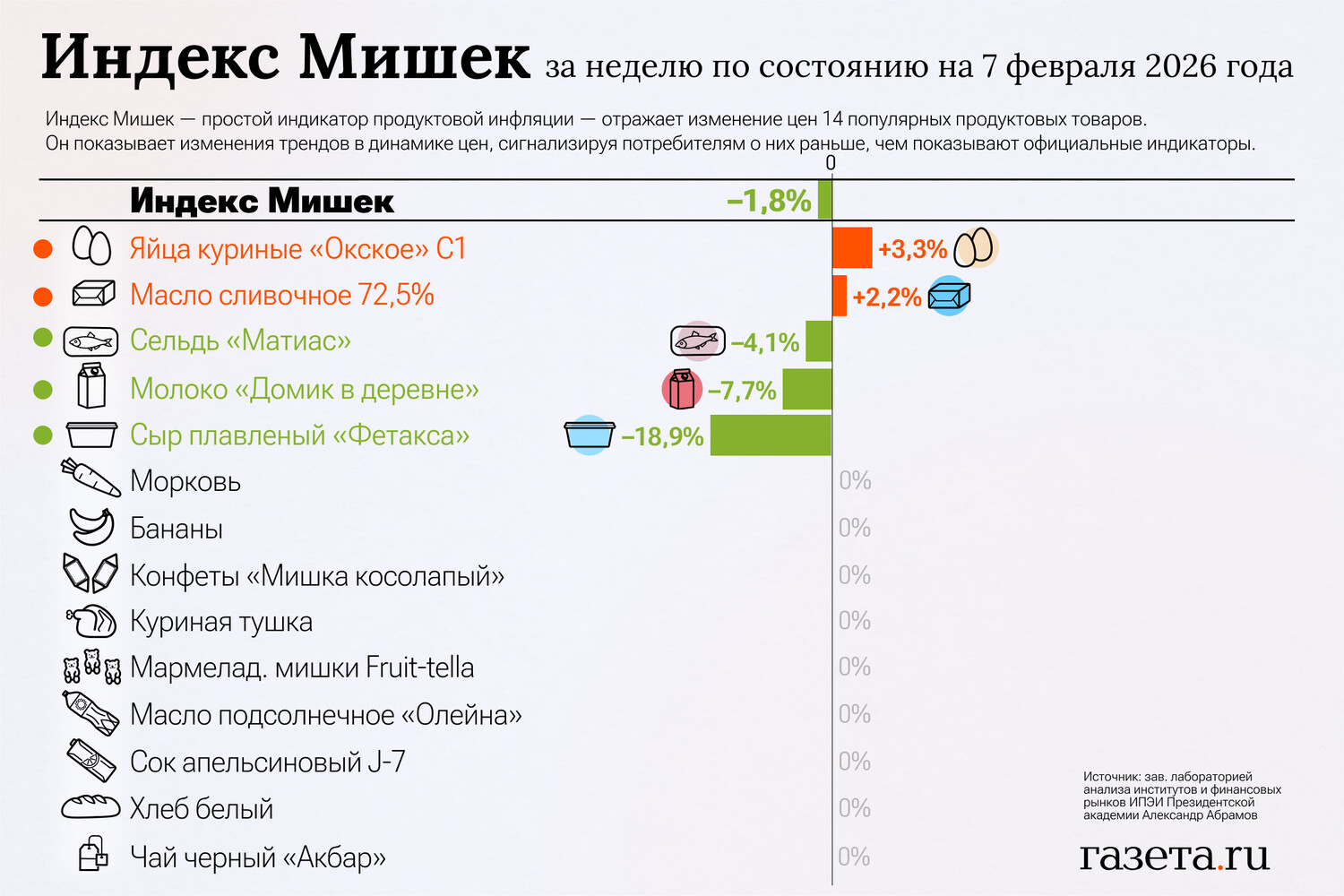 «За неделю значение Индекса Мишек снизилось на 1,8% по сравнению с его ростом на 0,9% неделю назад. За неделю подешевели плавленый сырный продукт «Фетакса» (-18,9%), молоко «Домик в деревне» 3,2% жирности (-7,7%) и сельдь «Матиас» (-4,1%). Выросли цены на яйца куриные «Окские» категории С1 (+3,3%) и на сливочное масло 72,5% жирности (+2,2%). Цены остальных товаров в индексе не изменились. В годовом выражении значение Индекса Мишек на 7 февраля упало на 1,8% по сравнению с его ростом на 5,5% неделю назад», — отметил Абрамов.