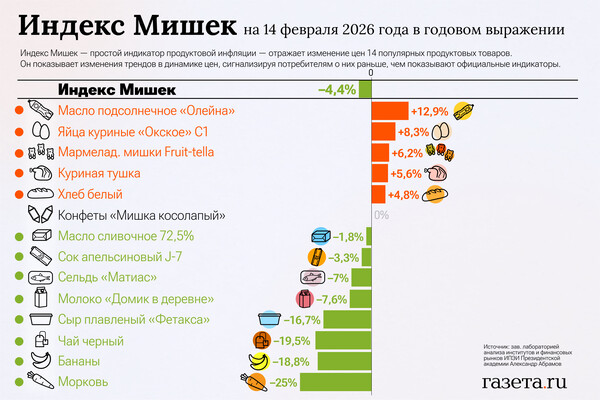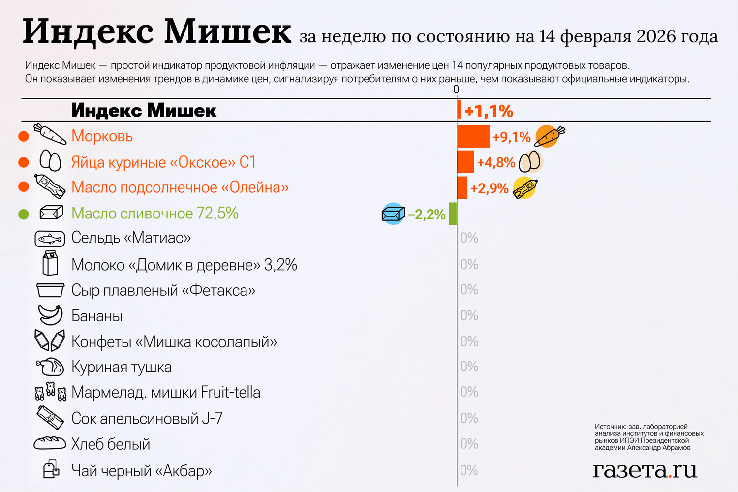 «Значение Индекса Мишек за неделю выросло на 1,1% по сравнению с его снижением на 1,8% неделю назад. За неделю подешевело сливочное масло «Домик в деревне» (-2,2%). Выросли цены на морковь (+9,1%), яйца куриные «Окские» категории С1 (+4,8%) и на растительное масло «Олейна» (+2,9%). Цены остальных товаров в индексе не изменились. В годовом выражении значение Индекса Мишек снизилось на 4,4% по сравнению с его снижением на 1,8% неделю назад», — отметил Абрамов.