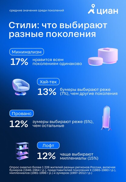 Миллениалы близки к зумерам: минимализм — 16%, лофт — 15% и хай-тек — 13%. Бумеры же отдают предпочтение минимализму (20%), провансу (14%) и делят третье место между неоклассикой и «парижской квартирой» (по 11%). При этом хай-тек и лофт им нравятся значительно меньше — 7% и 6% соответственно.