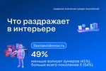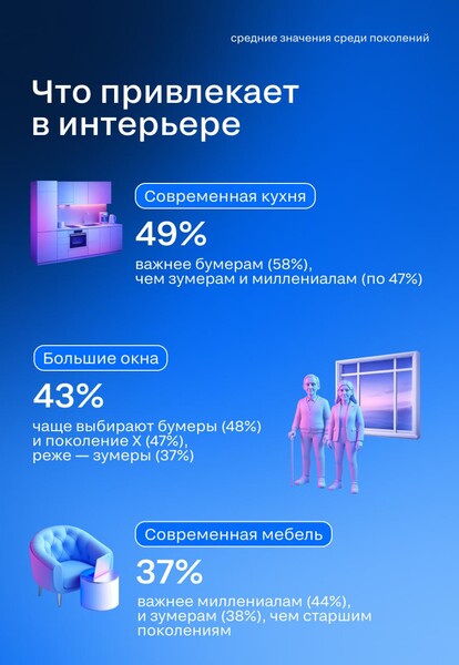 Зумеры и миллениалы особенно ценят современную мебель (38% и 44% соответственно), тогда как для бумеров и поколения Х критически важны кухня и санузел. Высокие потолки и светлые тона важны для 42% и 41% бумеров, но лишь для 28% зумеров. Зато именно молодежь чаще отмечает наличие зеленых растений (19%) и камина (19% у миллениалов) как плюсы.