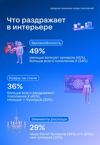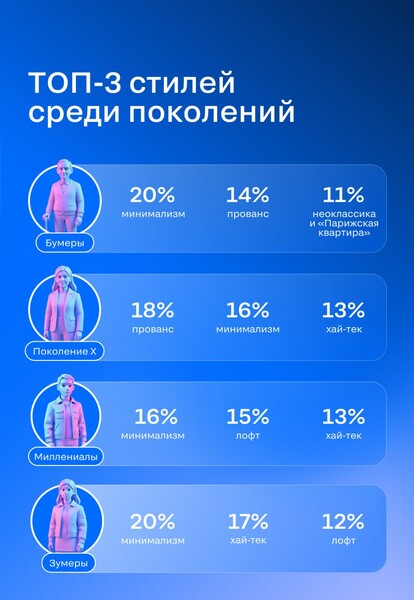 Стиль фьюжн оказался в антирейтинге у всех поколений. Также выявлены гендерные различия: женщины чаще выбирают минимализм (19%) и прованс (16%), мужчины — хай-тек (21%) и лофт (15%).