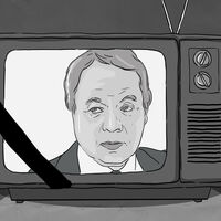 Изначально группа называлась «Телевидению России, программе «Вести» – 25 лет». Теперь исправили. А картинка все не меняется. Сидят Ельцин и Попцов и беседуют, и в беседе этой в переломном 1991 году рождается новое телевидение. Именно они двое и означают для всех то свободное ТВ новой России, в котором все были одних убеждений, все были демократы, в котором (недавно попалось видео) на сцене поют и пляшут совсем юные Галкин и Зеленский, а в зале над их шутками хохочет совсем честный Владимир Соловьев.