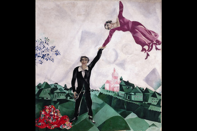 Знаменитая «Прогулка» Марка Шагала — одна из самых узнаваемых работ художника-авангардиста. На полотне Шагал изобразил себя и первую жену Беллу Розефельд — главную женщину своей жизни. Он познакомился с Беллой осенью 1909-го в Витебске.