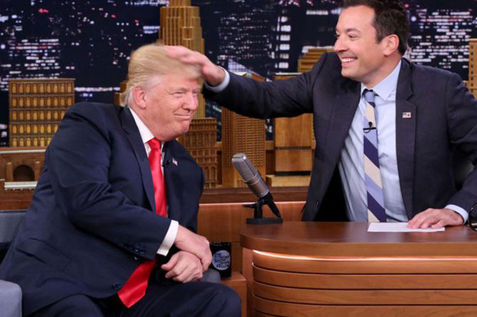 В 2016 году Фэллон пригласил к себе в шоу Трампа. В конце интервью ведущий попросил Трампа позволить ему взъерошить его волосы, на что тогдашний кандидат в президенты дал согласие. Этот эпизод вызвал негодование у многих коллег Фэллона, а также среди прессы.