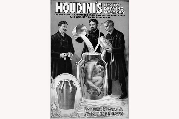 Один из своих простейших и популярнейших номеров Гудини начал исполнять в 1901 году. Он советовал зрителям осмотреть и даже пнуть метровый бидон для молока, чтобы убедиться в его прочности. На крышке было шесть застежек, которые проходили через шесть петель, прикрепленных к краю бидона. Емкость наполняли водой, а Гудини в это время переодевался в купальный костюм. Вернувшись, он просил зрителей засечь, как долго они смогут задерживать дыхание. Мало кто мог превысить 60 секунд. Улыбаясь, Гудини залезал в бидон, лишняя вода выливалась наружу.