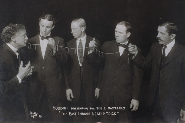 Фокусник просил зрителя осмотреть 50-100 игл и 18 метров ниток. Тот же зритель осматривал рот Гудини. Затем иллюзионист проглатывал все иглы и нитки, запивая их водой. Мгновение спустя Гудини их срыгивал — причем из его рта выходила нить, на которую были вдеты все иголки.