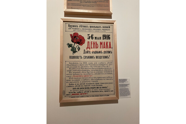 С начала XX века российские благотворительные организации часто проводили «дни цветов». Например, в День белой ромашки собирали средства для борьбы с туберкулезом, в День синего цветка — для больных и бедных детей. В обмен на пожертвование горожане получали искусственный цветок, который можно было приколоть на одежду и тем самым продемонстрировать свое участие в благотворительности. Эта афиша была сделана к мероприятию, которое проходило 5-6 мая 1916 года в пользу Кружка летних школьных колоний (детский лагерь для детей из семей, нуждающихся в благотворительной поддержке).