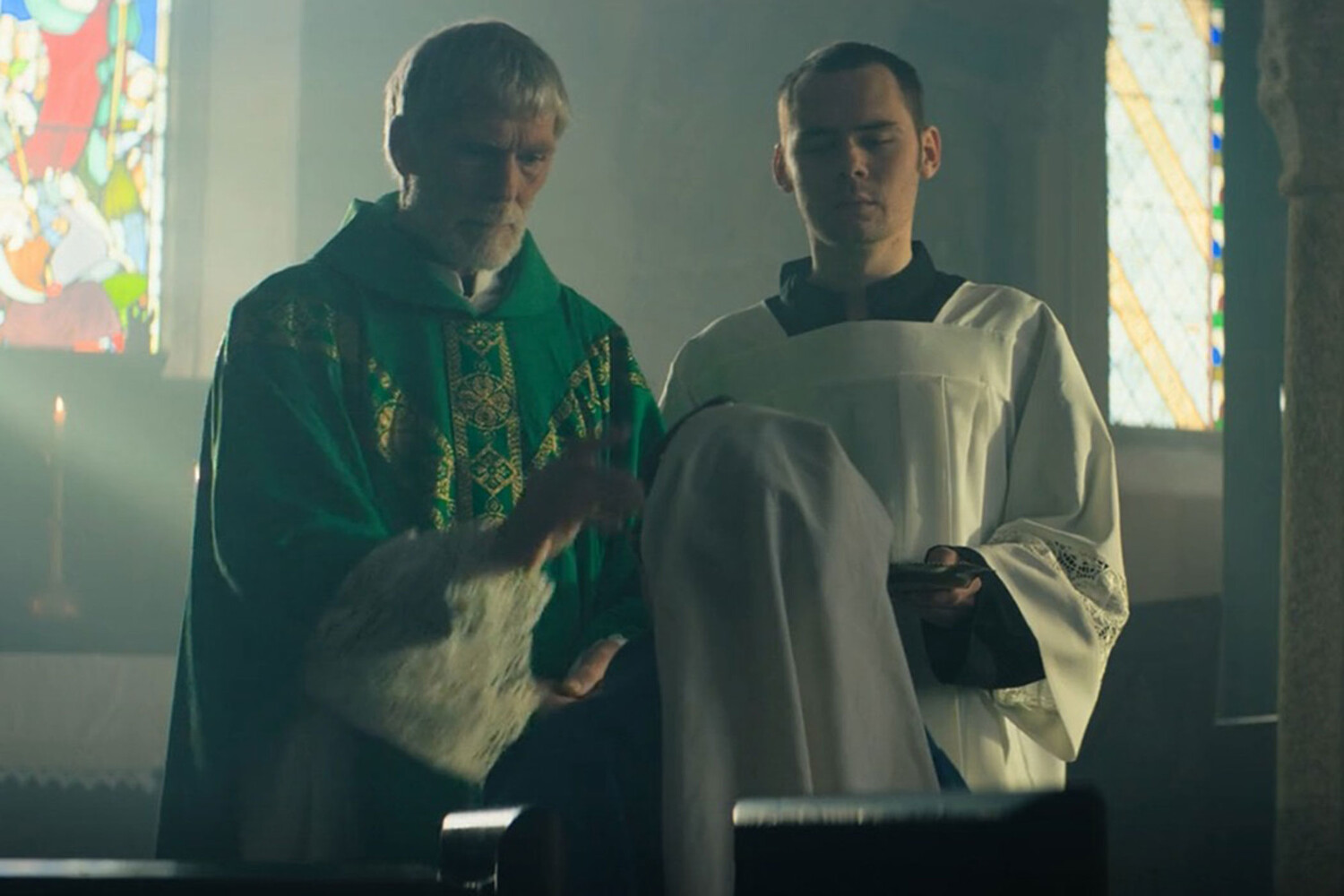 Рассеялось у Кермани и то разлитое в воздухе «Женщины-демона» эротическое вожделение, что часто перетекало в сексуальную фрустрацию. Самое возмутительное, что позволяет себе в этом смысле «Проклятый рыцарь», — изощренное продолжение инцестуальной традиции «Игры престолов» путем кастинга: дезертира изображает, собственно, Харингтон, а спящую с ним вдову — Софи Тернер, которая долгие годы была харингтоновской экранной сестрой на HBO. Отдельно стоит заметить, что роль маячащего между ними мертвого мужа (в этой версии все трое — друзья детства) доверена еще одному фигуранту той же съемочной площадки Лоуренсу О'Фуарану, чьей первой строчкой в фильмографии был финальный эпизод пятого сезона «Игры престолов»: в нем артист появился в образе одного из захватчиков замка Винтерфелл (стало быть, кошмарить Тернер ему не впервой).