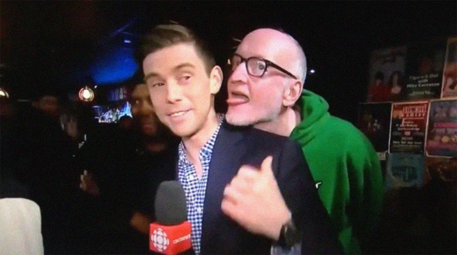 Канадский комик Бойд Бэнкс облизал ухо корреспондента телеканала CBC Криса Гловера во время прямого эфира. Об этом сообщает CBC.