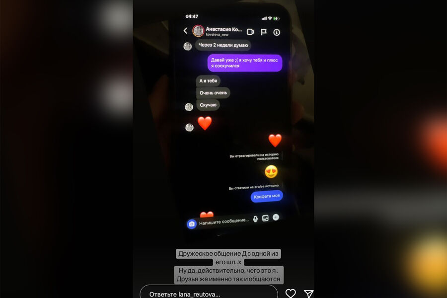 Жена рэпера Птахи (настоящее имя — Давид Нуриев) Лана Реутова опубликовала в Instagram (компания-владелец Meta признана экстремистской организацией) любовную переписку супруга с бывшей участницей «Дом-2» Анастасией Ковалевой. Реутова подчеркнула, что устала от постоянных измен мужа.