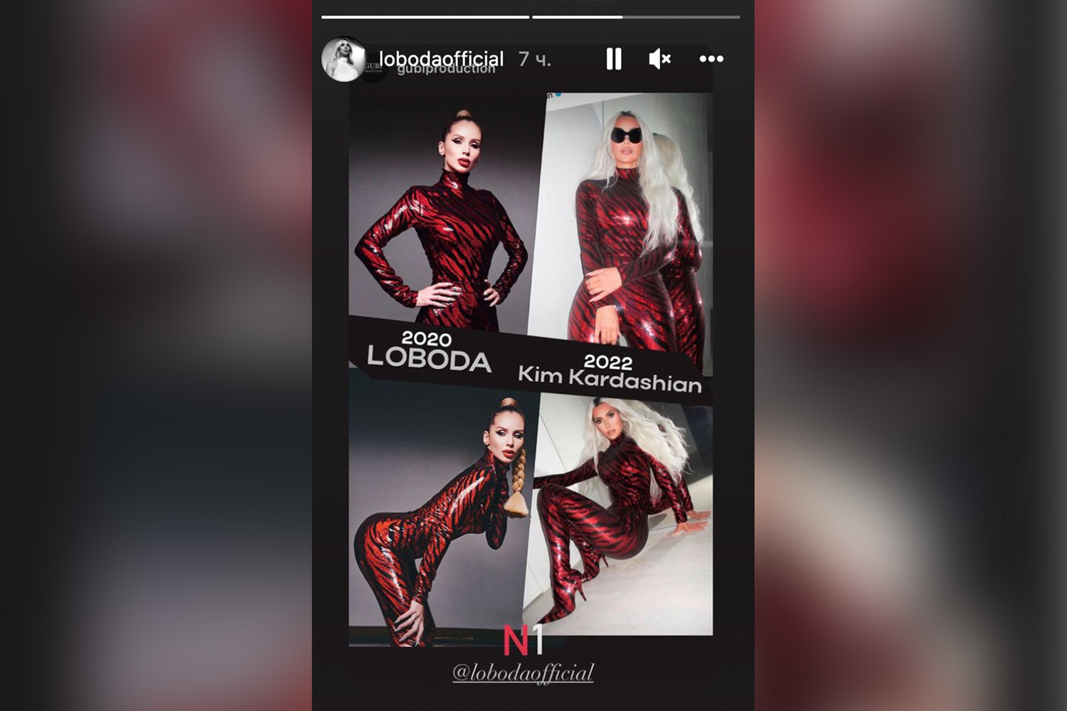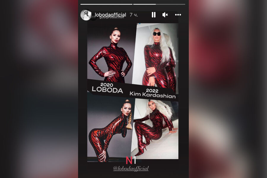 На фото женщины одеты в красно-черный комбинезон. Как рассказала исполнительница, съемка с ее образом производилась в 2020 году, в то время как Кардашьян позировала в похожем образе в этом году. Под фото Лобода оставила подпись «N1».