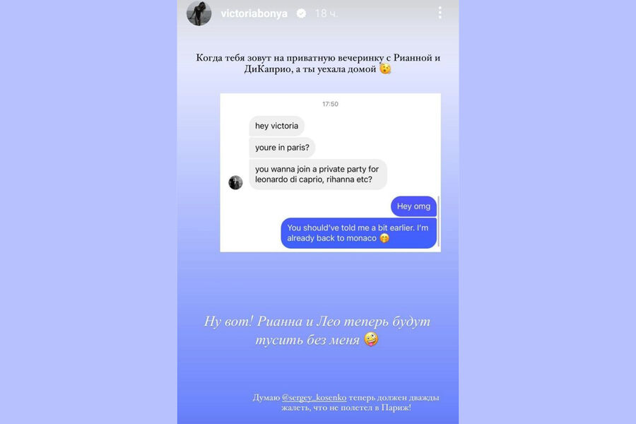 На изображении видно, как собеседник знаменитости предложил ей провести время в Париже на закрытой вечеринке, где будут присутствовать Леонардо ДиКаприо и Рианна. Однако Боня ответила отказом, поскольку уже уехала из Франции, где провела некоторое время в путешествии.