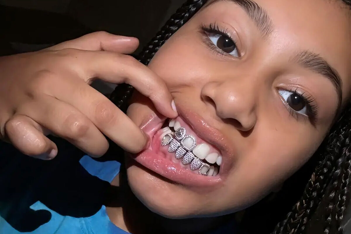 Дочь рэпера Канье Уэста Норт установила на зубы бриллиантовые украшения — гриллзы. Фото с гриллзами она опубликовала на своей странице в социальной сети TikTok.