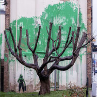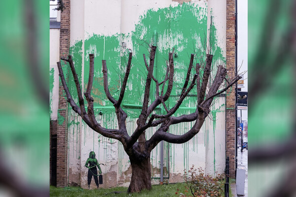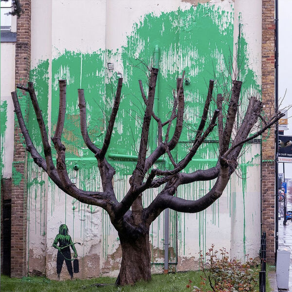 О новой работе Бэнкси в Лондоне стало известно 18 марта. Мурал на жилом доме в парке Финсбери изображает абстрактные зеленые листья и фигуру женщины, поливающей дерево водонапорным шлангом.