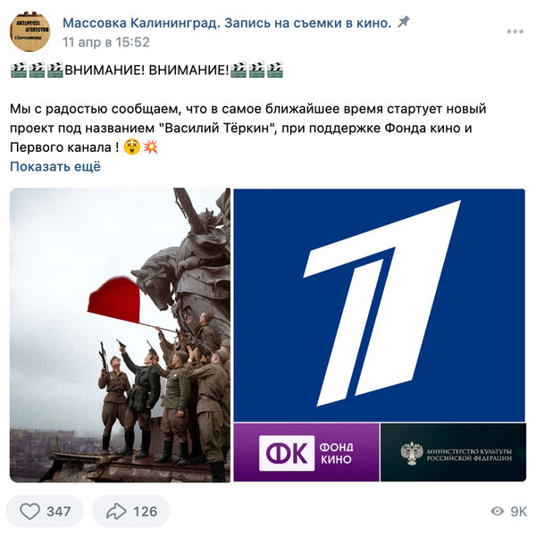 «Это очень масштабный проект про Великую Отечественную войну с большим количеством известных актеров и захватывающим сюжетом! Людей нужно будет много, но требования серьезные», — написали представители сообщества.