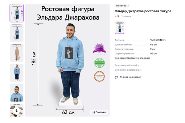 Покупателям предлагают купить картонного Джарахова, рост которого 185 см. Интернет-пользователи отметили, что фигура выглядит нереалистично, поскольку настоящий рост рэпера 158 см.